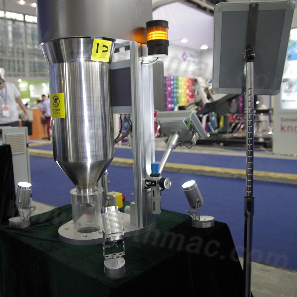Picture1: The material starting-up status. The GMS-50 gravimetric control system for plastic extrusion line is installed between the material storage hopper and the extruder throat. It monitors the loss in weight of the material in its weigh chamber and from this calculates the mass throughput rate of the extruder. In auto control mode our product can control the extruder or the production line speed to maintain a set output or a set product weight per unit length.